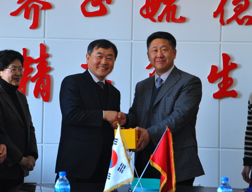 最后,马立群校长与裵度淳校长在合作协议书上郑重签字,并互赠礼物、合影留念。