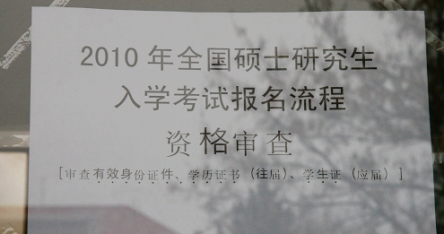 在东区学生指导中心一楼大厅,在大厅入口的大门上,粘贴着“2010年全国硕士研究生入学考试报名流程”、“2010年全国硕士研究生入学考试现场报名时间表”和“黑龙江省2010年硕士研究生全国统一入学考试考风考纪教育公告”等公告信息,前来报名现场确认的考生在大厅入门处即可看见。