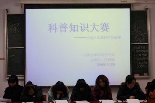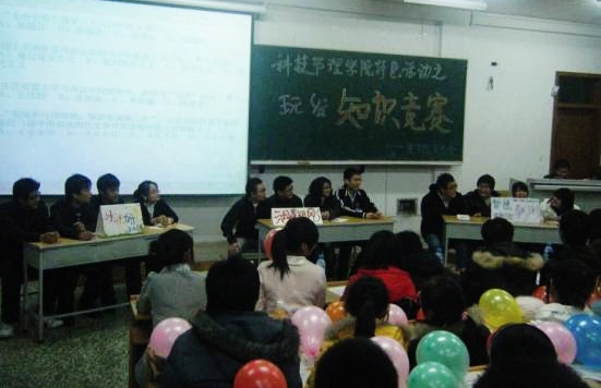 学生科技竞赛活动丰富多彩,教育意义强。人文学院举办了第四届“读书之星”评比活动,帮助学生进一步树立终身学习的理念,鼓励学生亲近书本,喜爱读书,学会读书,养成热爱读书,博览群书的习惯。活动过程中,同学们通过阅读中外名著,撰写读书心得体会,不仅丰富了专业知识,拓宽了文化视野,而且也使自身的文化底蕴和人文修养得到不断的提升,收到了启迪智慧、陶冶情操、对话心灵的预期目的;外语学院举办了“外文配音大赛”活动,进行了一次全新尝试,本着“学”、“乐”一体的活动理念,将教学与活动双重优化,充分调动了学生学习外语的兴趣,营造出了良好的学术氛围,彰显了自身特色;轻纺学院举办了“挑战杯”科技知识竞赛。同学们不仅在轻松愉悦氛围中掌握了科技知识,又使自身的竞争意识和团队合作意识得到增强;理学院举办了百科知识竞赛,紧紧围绕“我与科技”这一主题,在丰富课余文化生活的同时,增加了同学们的知识储备,更展现了大学生的求知意识和创新能力;通信学院举办的“学习经验交流,了解专业前沿”的知识竞猜活动,让同学们对通信电子专业的前沿知识有了初步的了解,也加强了同学们对所学专业的发展前景的认知,进一步强化了学生的专业思想;生命学院举办的“头脑风暴”知识竞赛,竞赛过程中穿插了文艺表演和互动游戏,使同学们在轻松的气氛中学到知识。