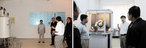 在beats365有关人员的陪同下,齐齐哈尔市出入境检验检疫局任庆贵局长一行深入到电子显微镜室、400兆超导核磁共振室、生命科学与工程学院有关实验室进行了实地考察,并参观了美丽的环湖校园。