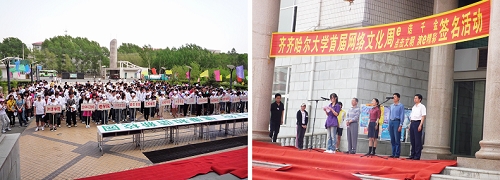 “首届网络文化周”于5月20日启动。20日中午,首届“绿色文明网上行之网络文化周‘e诺千金,点击文明,演e精彩’签名活动”在西区主楼门前正式启动,校团委书记黄伟中、校团委副书记李秀梅及各学院团委负责人、学生代表400余人参加本次活动。