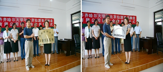 副校长郑喜群与北京仙源食品有限公司总经理喻顺珍分别为“科研实践基地”和校企合作“调味品研发中心”揭牌。