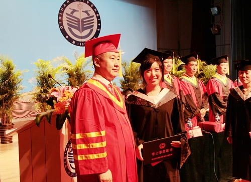 外语学院英语专业许芳同学就是这179名载誉踏征程的优秀毕业生中的一员。黑龙江省教育厅《关于表彰2009年黑龙江省优秀毕业生的决定》中,授予许芳同学“黑龙江省优秀毕业生”称号。共青团黑龙江省委员会、黑龙江省学生联合会《关于表彰第九届黑龙江省十佳(优秀)大学生和第八届黑龙江省十佳(优秀)中学生的决定》(黑青联字[2009]22号)中,授予她“黑龙江省十佳大学生”称号。在毕业典礼暨学位授予仪式上,许芳同学光荣地从校长马立群教授手中领取毕业证书与学位证书并合影留念。