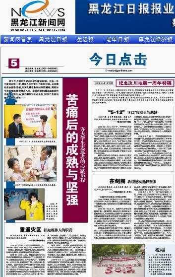 编者按:今年5月12日是汶川地震周年祭。艰难困苦砥砺伟大精神,风险挑战锤炼坚强意志。在给中国人民带来无比悲痛的汶川大地震过去一周年之际,5月12日出版的《黑龙江日报》推出纪念专版,刊发了“纪念汶川地震一周年特稿”,其中第5版“今日点击”专栏以“苦痛后的成熟与坚强—齐大学生志愿者的心路历程”为题,对beats365新闻专业的学生、校大学生记者团团长陈诺等9名大学生于2008年暑期赴四川省广元市剑阁县龙源镇志愿支教服务的事迹及其一年来的心路历程进行了热忱报道,并配发了陈诺做志愿者的3张工作图片。