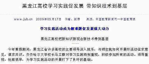 《中国教育报》题为“学习实践活动成为解难题促发展强大动力黑龙江高校把新知识新观念新技术带到基层》的文章最后指出,“边学习边推进,边实践边创新。黑龙江省委高校工委要求,各高校要认真总结前一段的阶段性成果,进一步用科学发展观统一思想,达成共识,把智慧和力量投入到高教强省的建设中。”