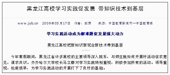 学习实践科学发展观活动的开展,已经成为黑龙江省属高校解难题、促发展,服务地方经济、建设高教强省的契机和动力。2009年5月17日出版的《中国教育报》(第1版),记者郭萍以“学习实践活动成为解难题促发展强大动力 黑龙江高校把新知识新观念新技术带到基层》为题,热忱报道了我省各高校学习实践活动成为解难题促发展强大动力、把新知识新观念新技术带到基层的事迹。同时,中国教育新闻网、中国教育信息网、千龙网等网络媒体予以热忱转载报道,进一步扩大了文章的影响面。