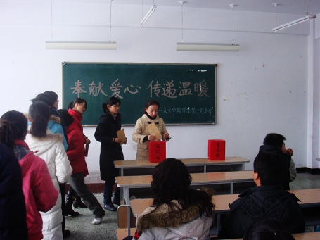 人文学院学生第一党支部全体党员及积极分子观看了大型纪录片《复兴之路》。在观看的过程中,党员和积极分子都被影片所震撼,同学们一致表示要努力学习,为中华民族伟大复兴而努力拼搏。12月3日,该支部全体党员、积极分子又举行了“奉献爱心 传递温暖”的资助家庭经济困难儿童的捐款活动,并将这笔钱送到困难小学生朱忠宇的手中。