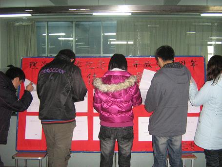 理学院党委自11月13日起,在学生各党支部中先后举办了以“纪念改革开放三十周年”为主题的征文比赛、 图片展、参观和平广场、座谈会和以“风雨征程三十载,扬帆逐浪竞风流”为主题的诗会演讲比赛、纪念改革开放三十年征文佳作展览活动。在此次征文活动中,师生共提交征文103篇,展出佳作40篇;征文从教育、航天、卫生、环境、经济等多角度出发,描绘了一幅改革开放三十年的发展图。通过系列主题党日活动,使学生党员受到了教育、得到了锻炼,大家纷纷表示要以身作则,积极发挥党员的先锋模范带头作用,践行自己的承诺,为学校学院又好又快发展贡献自己的力量,为将来奉献社会打好基础。