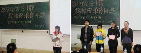 为纪念我国改革开放三十周年,增强学生的历史责任感和使命感,计控学院第一、二党支部于11月12日晚在西主J204联合举办了以“改革开放三十载,扬帆逐浪竞风流”为主题的演讲比赛。