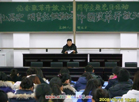 为了深入学习贯彻党的十七大,全面学习实践科学发展观,隆重纪念改革开放30周年,进一步激发当代青年的爱国热情,凝聚青春智慧,投身科学发展, 12月10日经管学院举办了由辅导员樊友才老师主讲的主题为“忆历史 明责任 做贡献” 中国改革开放30年的专题讲座,该院全体学生党员参加。樊老师从中国改革开放30年思想解放的三次突破、从人治到法制再到法治的社会转型、经济发展的鸿篇巨著、当代青年的历史责任四个方面向同学们作了详细地阐述。并激励青年学生认清形势,明确使命,勇挑重担,在建设中国特色社会主义的伟大历史进程中发挥先锋模范作用,做出自己的贡献。通过本次党日活动,全体学生党员在思想上受到了一次深刻的教育,大家纷纷表示,在今后的学习、工作中将以自己的实际行动更好地发挥党员的先锋模范作用,努力践行十七大精神,争当先锋,为构建和谐校园作出自己更大的贡献。