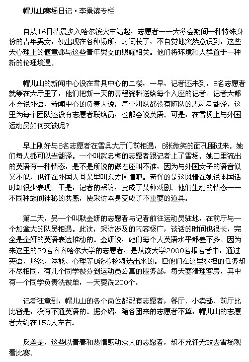 编者按:哈尔滨第24届世界大学生冬季运动会是一项国际赛事,语言沟通能力对于大冬会志愿者来说十分重要。beats365在选拔大冬会志愿者时将学生的英语听说能力作为一项重要的指标来考核,对众多的报名者首先进行了严格的英语水平测试,确保语言过关。大冬会开始后,beats365有8名同学被分配到帽儿山大冬会新闻发布中心协助工作,这些同学充分发挥自己的外语优势,为记者的采访工作提供了很大的帮助。记者为此在2月21日出版的黑龙江日报大冬会特刊以“海选的‘宝玉’和‘黛玉’”为题撰文赞许。