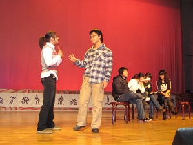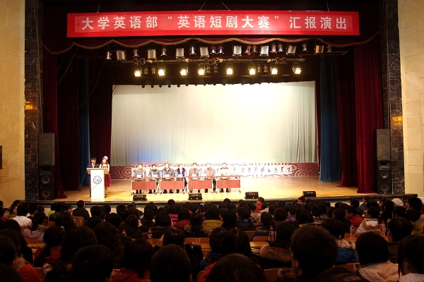 进行汇报演出的六个选送英语短剧中,既有经典的爱情故事“梁祝”,“孔雀东南飞”,又有贴近生活,反映汶川大地震的“梦想”;既有童话故事“灰姑娘”“魔豆”,又有改编自世界名著的“如此项链”。令人捧腹的幽默创意,天马行空的戏剧狂想,大学生们无穷的创造力在这里一一呈现,处处精彩。经过激烈漫长的初赛和决赛,他们收放自如的表演,流畅地道的口语展现了大学生的风采;而作为观众的08级新生更是沉浸在演员们表演当中,他们的掌声和欢呼也展现了大学生的热情。