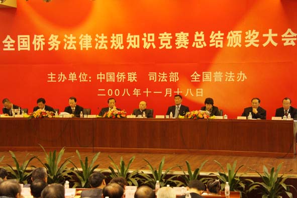 由中国侨联、司法部和全国普法办联合组织主办的侨务法律法规有奖知识竞赛在全国引起积极反响,主办单位于11月18日在北京举行了本次竞赛的总结颁奖大会。司法部副部长、全国普法办副主任张苏军、中国侨联副主席林淑娘、中国侨联副主席李祖沛、董中原、中国侨联法顾委主任邹瑜等参加会议,对参加“侨务法律法规有奖知识竞赛”的获奖单位进行了通报表彰。