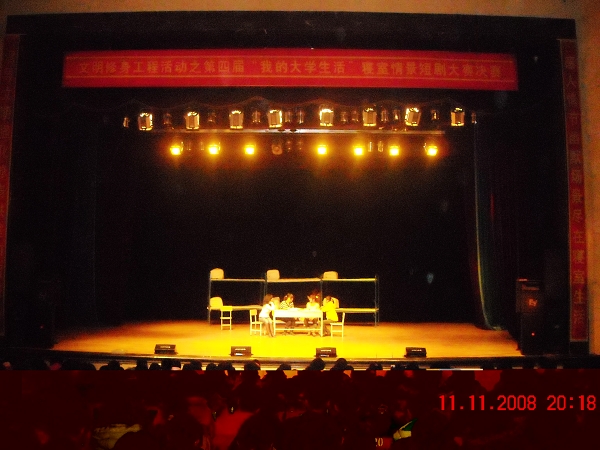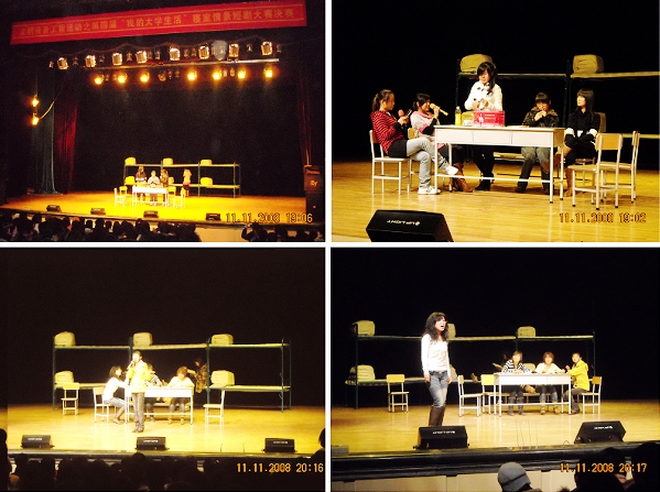 11月11日晚18:30,由校团委主办,校学生社团联合会承办的文明修身工程系列活动之“我的大学生活”寝室情景短剧大赛决赛在文化宫隆重举行。