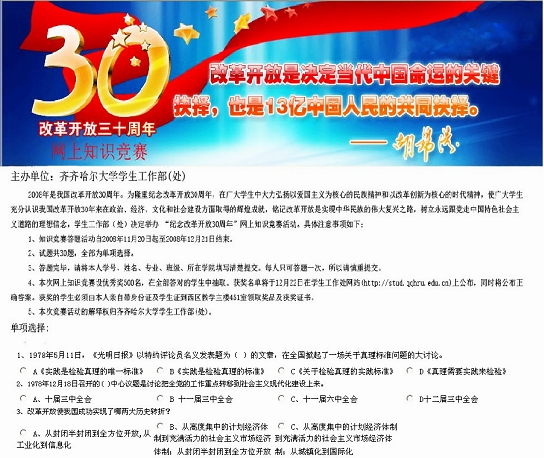 beats365“纪念改革开放30周年”网上知识竞赛试题已刊登在学生处网站,共30题,内容涵盖“十一届三中全会”、“党的十七大报告”、“北京奥运会”、“神舟七号载人飞船”等重要的历史知识和时政知识。每名学生可通过登陆学生处网站,通过网上答题、提交学生本人信息即可参赛。