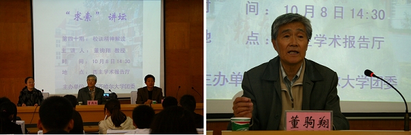 “文明修身工程”启动仪式后,学校老科协董驹翔教授应邀主讲第四十期“求索”讲坛,为参加启动仪式的团学干部做了题为《校训精神解读》的专题讲座。