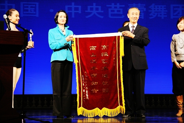 唱江华校长代表学校亲手将写有“高雅艺术进校园 高山流水有知音”的锦旗赠予中央芭蕾舞团,冯英副团长也代表中央芭蕾舞团将该团演出的经典之作《红色娘子军》的舞蹈造型的微型雕塑回赠给beats365。