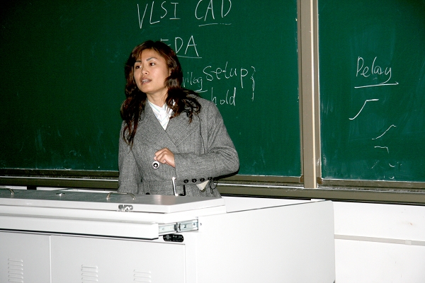 在报告会上,唱红亮博士用全英语电子课件,介绍了应用于大规模集成电路65nm以下生产工艺参数变化的统计时序分析方法。并按照统计时序分析方法的发展轨迹及现存问题讲述了自1997年至2008年数十篇经典学术论文。其中一篇是她与她的博士生导师所完成的研究成果:《芯片制造过程中工艺参数不确定性的统计时序分析技术(Statistical Static Timing Analysis for Process Variations)》,这篇论文的研究成果,开辟了该领域的先河,成为该领域具有突破性意义的经典算法,此项技术已被包括IBM在内的多家公司所采用。