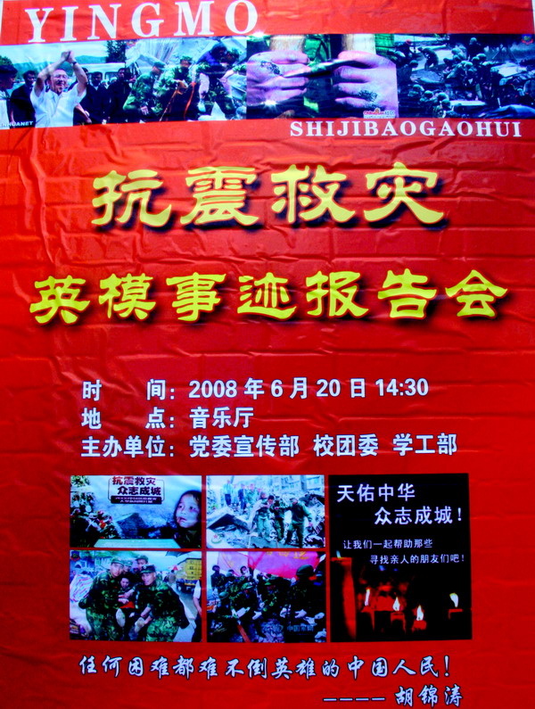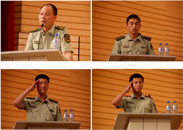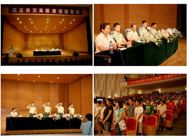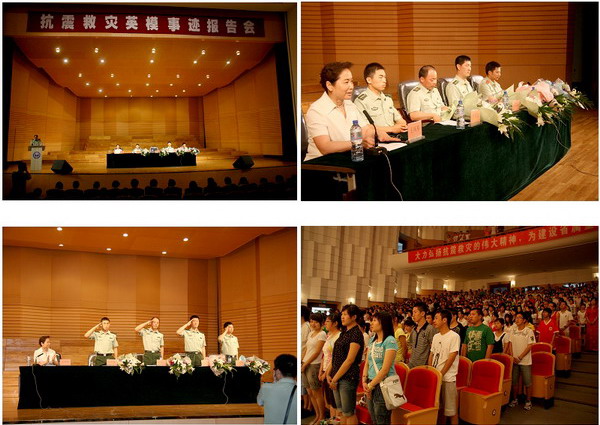 “齐齐哈尔市抗震救灾英模事迹报告团”成员:市消防支队副支队长、赴川抗震救灾突击队队长石家滨同志以《为灾区擎起一片蔚蓝的天空》为题,市消防支队三中队副中队长、三江突击分队队员王兆敏同志以《冲破险阻进三江》为题,市消防支队特勤大队中队长、北川突击分队队员刘凯同志以《战士,要在人民最需要时候挺身而出》为题,市消防支队一中队四川籍战士王家强同志以《为了生养我的那片热土》为题为同学们做了一场生动、精彩、感人而富有教育意义的报告。