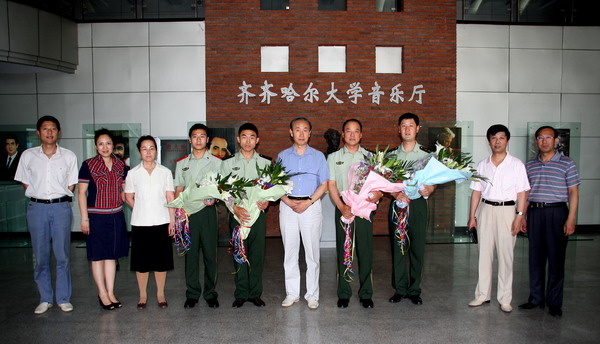 校长唱江华、校党委副书记王凤琴亲切会见了“齐齐哈尔抗震救灾英模事迹报告团”成员:市消防支队副支队长、赴川抗震救灾突击队队长石家滨同志,市消防支队三中队副中队长、三江突击分队队员王兆敏同志,市消防支队特勤大队中队长、北川突击分队队员刘凯同志,市消防支队一中队四川籍战士王家强同志,并与他们合影留念。