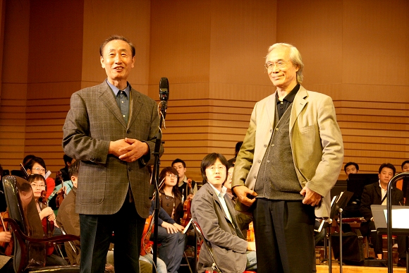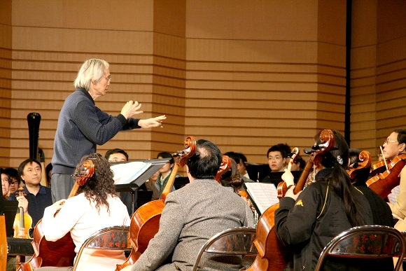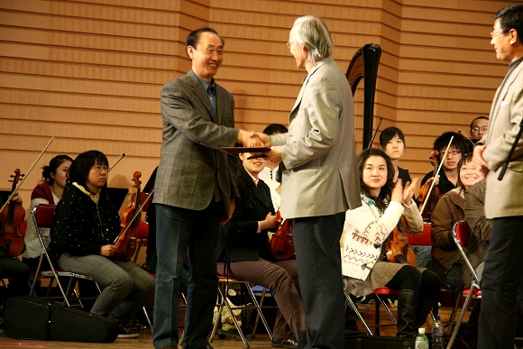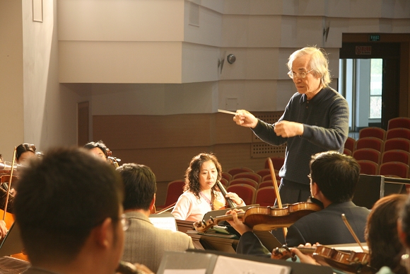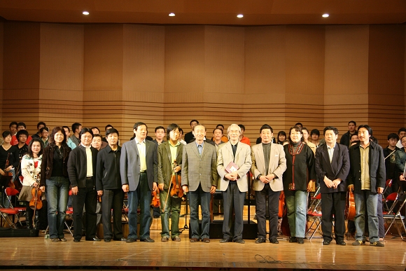 在观看了beats365交响乐团的现场排练活动之后,卞祖善先生亲自登上指挥台,逐音部、逐章节地对乐团进行了艺术指导。历时两个多小时的指导过程,让台上台下的所有师生们真切地感受到了一位长者、大师精深的艺术修为,深厚的人格魅力和执着的专业精神。