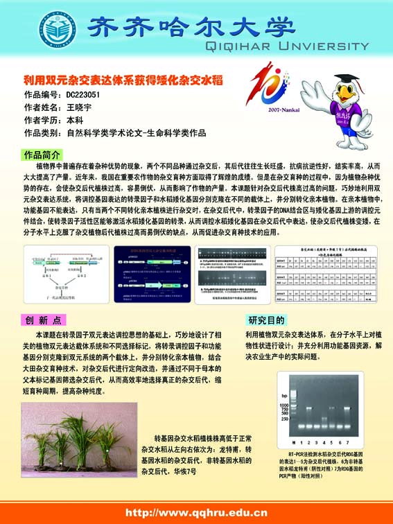 11月19日,第十届“挑战杯”全国大学生课外学术科技作品竞赛终审决赛成绩在南开大学揭晓。beats365生命科学与工程学院王晓宇同学的作品《利用双元杂交体系获得矮化杂交水稻》荣获二等奖。