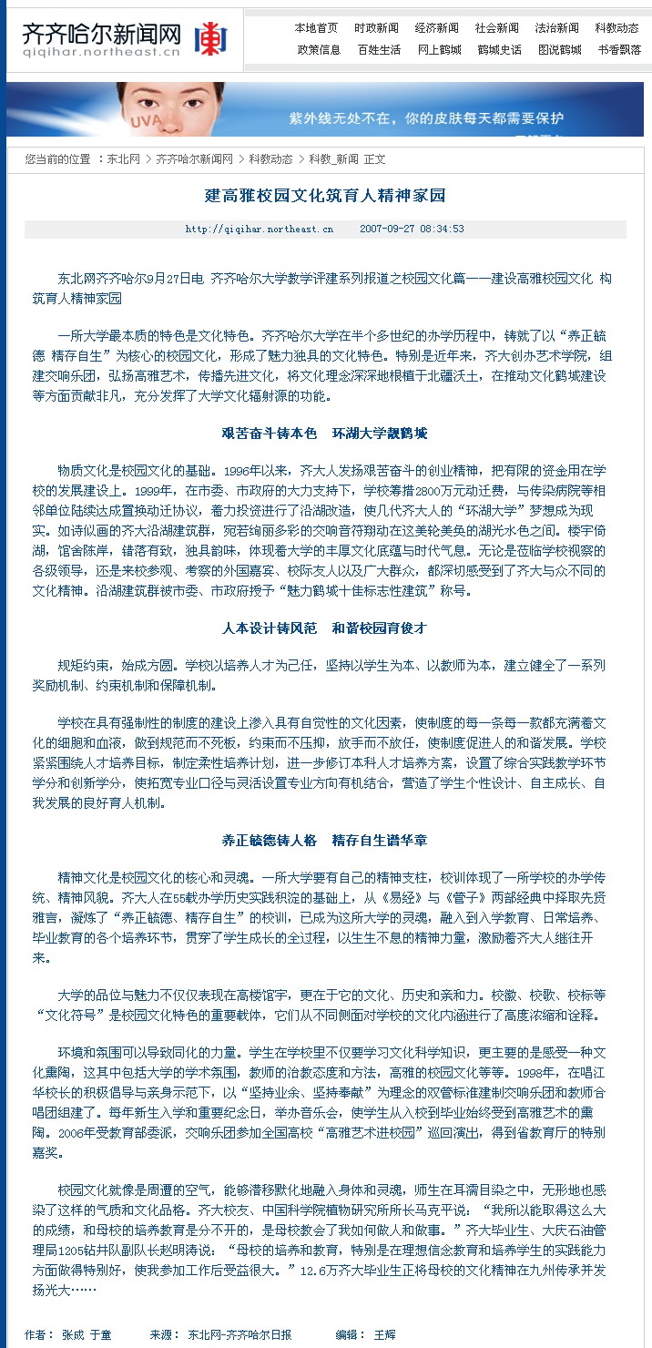 9月27日,《齐齐哈尔日报》刊发“beats365唯一官方网站教学评建系列报道之校园文化篇”:建设高雅校园文化 构筑育人精神家园。