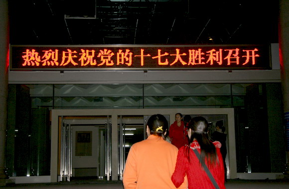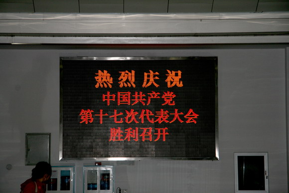 在东区人文楼、学生指导中心大厅,中区和西区教学主楼,以及西区主楼前的电子显示屏上,均能清晰看见“热烈庆祝党的十七大胜利召开”等宣传口号;
