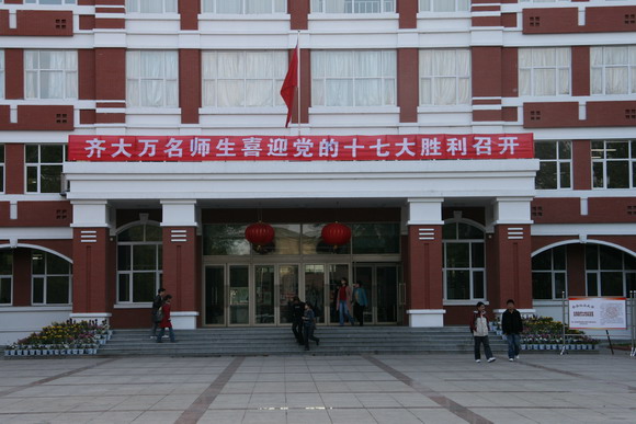 东、中、西、南四个校区,“齐大万名师生喜迎党的十七大胜利召开”等标语十分醒目。