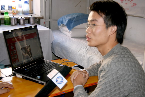 在学生寝室,教育与传媒学院新闻学专业的钱进等同学通过校园网络在第一时间收听收看了十七大开幕式的盛况,聆听了胡锦涛总书记的工作报告。在接受齐齐哈尔电视台记者采访时,钱进同学表示,“聆听胡总书记的报告,感觉亲切,备受鼓舞,将指引我们这些当代大学生在建设中国特色社会主义事业的伟大道路上奋勇前进!”