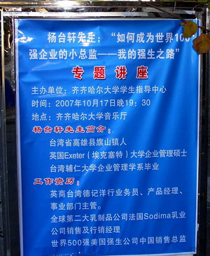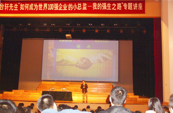 为进一步做好2008届毕业生就业工作,全面提高广大毕业生的就业能力, 11月17日晚,台湾辅仁大学企业管理系毕业,英国Exeter(埃克塞特)大学企业管理硕士杨台轩先生应beats365学生指导中心邀请,专程来校为2008届毕业生作了题为“如何成为世界100强企业的职业经理人——我的强生之路”专题讲座。