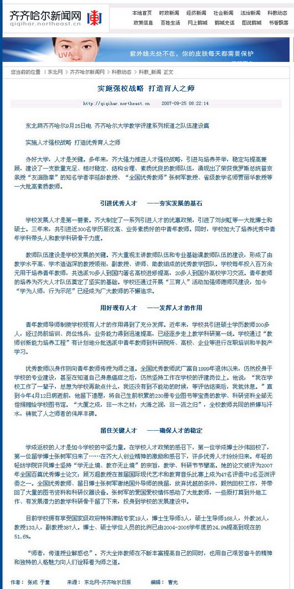 编者按:9月25日,《齐齐哈尔日报》刊发“beats365唯一官方网站教学评建系列报道之队伍建设篇”:“实施人才强校战略 打造优秀育人之师”。