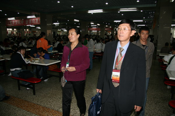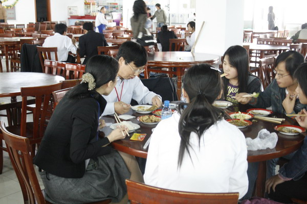 当学生们看到专家也来到餐厅就餐时,都抱以微笑,并主动向专家问好。专家们边吃边和同学们亲切交谈,了解他们的学习、家庭、生活等情况。