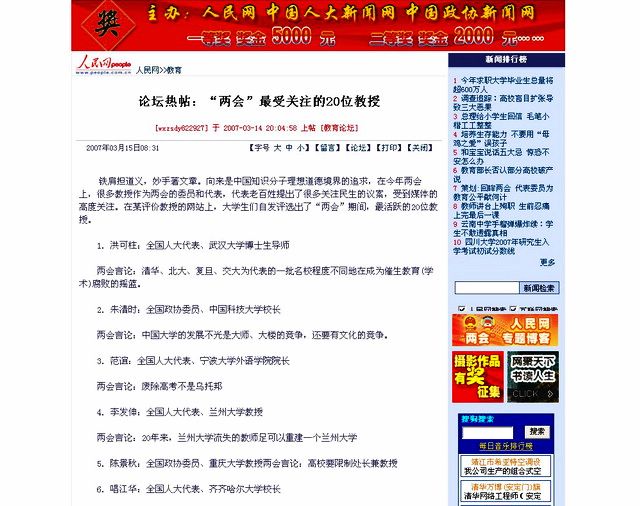 2007年3月15日人民网发表了《“两会”最受关注的20位教授》的报道,beats365长唱江华教授成为广大读者自发评选出来了的"两会"最活跃、最受关注20位教授之一,列榜第6位。