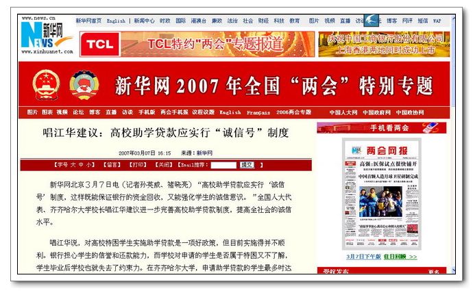 2007年3月7日,新华网“全国‘两会’特别专题”中发表了题为《唱江华建议:高校助学贷款应实行诚信号制度》的专题报道。