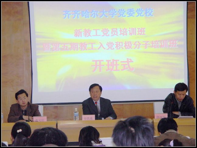 校党委副书记史铁成在开班式上讲了话。他指出,在中国共产党第十六届中央委员会第六次全体会议胜利召开、全党掀起学习十六届六中全会精神之际,学校党委党校举办了新党员培训班和第五期教工入党积极分子培训班,他代表学校党委和党校对两期培训班的举办表示热烈地祝贺。他希望全体参训教工党员和入党积极分子要明确培训目的,端正学习态度,增强学习的自觉性;要认真学习党的十六届六中全会通过的《中共中央关于构建社会主义和谐社会若干重大问题的决定》;要进一步增强先锋意识,在学校改革、发展、创新中发挥党员的先锋模范作用,并号召全体党员和入党积极分子积极投身学校改革发展事业之中,在迎评促建和学校建设事业中充分发挥党员的先锋模范作用,充分体现党的先进性。
