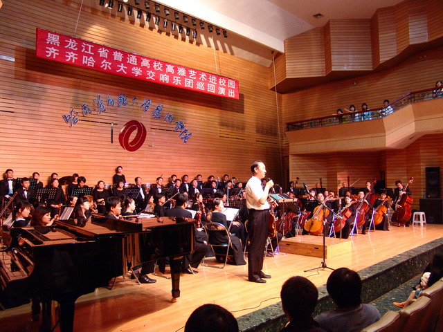 哈尔滨师范大学艺术类专业在我省高校中具有比较高的知名度,能够到哈师大演出和交流,乐团的全体成员都感到非常高兴,无形中也增加了一丝压力。不过,唱江华校长演奏前的一句玩笑话使现场的气氛顿时活跃起来,他说,我们乐团有不少老师都是从哈师大毕业的,这次演出不仅仅是学习和交流,更是向母校的一次汇报演出,如果没演好,大家一定要谅解,那是因为当初老师没教好。唱校长的幽默博得了现场观众的一片笑声,大家为齐大这位酷爱艺术又风趣幽默的校长鼓掌喝彩。