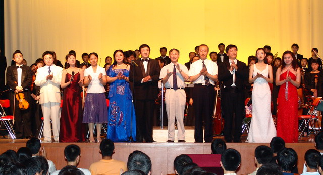 晚6:30,音乐会在交响序曲《红旗颂》中拉开了帷幕。一曲曲优美的旋律,赢得了现场观众阵阵掌声,现场观众被音乐的魅力感动,被音乐的旋律引导,被音乐的世界同化。演出在校长唱江华的一曲小提琴独奏《梁山伯与祝英台》选段和副校长邓启刚的男高音独唱《跟你走》中达到了高潮,同学们通过赠送鲜花表达对老师表演由衷地赞美。音乐会在交响乐团演奏的《拉德斯基进行曲》和全场有节奏的掌声中圆满结束。全场掌声不断,同学们迟迟不肯离去。在掌声中祝愿我们两校之间的友谊地久天长,通过交流与合作为祖国培养更多、更优秀的人才。