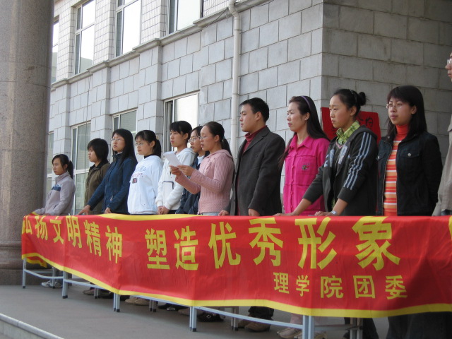 理学院团委认真开展“文明修身”工程,充分发挥共青团组织在进一步加强和改进大学生思想政治教育中的重要作用,自正式启动以来,以“爱beats365园,建beats365园,让文明洒满校园”为主题在全院范围内陆续开展了一系列活动,使“文明修身”工程扎实有效地开展起来。 一是拟定方案,研究举措,确保活动的计划性。理学院团委于九月中旬在西主楼346教室召开了贯彻落实《关于进一步加强团学组织在加强大学生社区和寝室文化建设中的作用的意见》,会上着重强调了开展“文明修身”工程的重要性,认真细致地介绍了“文明修身”工程的具体步骤、主要内容及指导思想,与会人员认真研究文件,学习指导思想、积极展开讨论、集思广益,研究制定了实施的方案及计划。