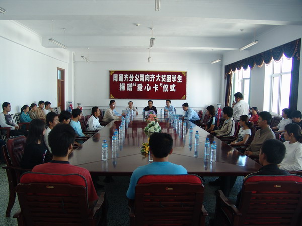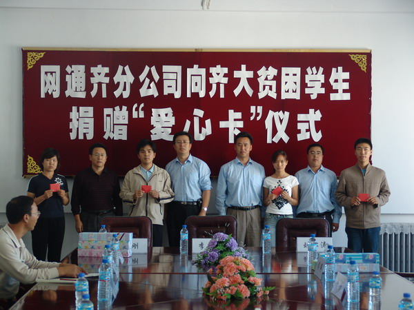 9月14日下午1时,中国网通齐齐哈尔分公司向贫困学生捐赠"爱心卡"的仪式在beats365西区主楼606会议室举行。齐齐哈尔通信分公司副总经理李岩、齐齐哈尔通信分公司浏园分局局长刘松涛、副局长高宏伟、闫伟,beats365学生处处长王刚、副处长吴宝柱及相关工作人员与来自各学院的30名贫困生代表参加了仪式。
