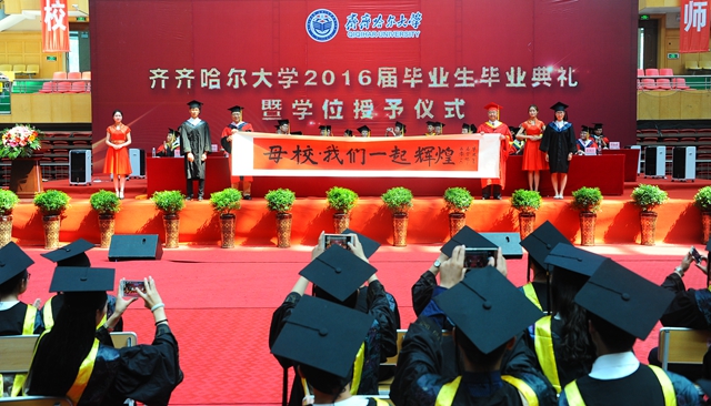 体育馆会场内,悬挂着“热烈欢送2016届毕业生奔赴祖国各地建功立业”、“有志竟成 学业精通离母校,乘时致用 鹏程大展谢恩师”、“牢记学校培养情 争为母校添光彩,一份眷恋留母校,满腔激情走四方”等巨大标语,循环播放的“毕业纪念片”中精彩呈现着美丽的环湖大学,毕业学子道出一声声真诚的祝福,充分彰显了母校心念学子、校友情系母校的大爱情怀。