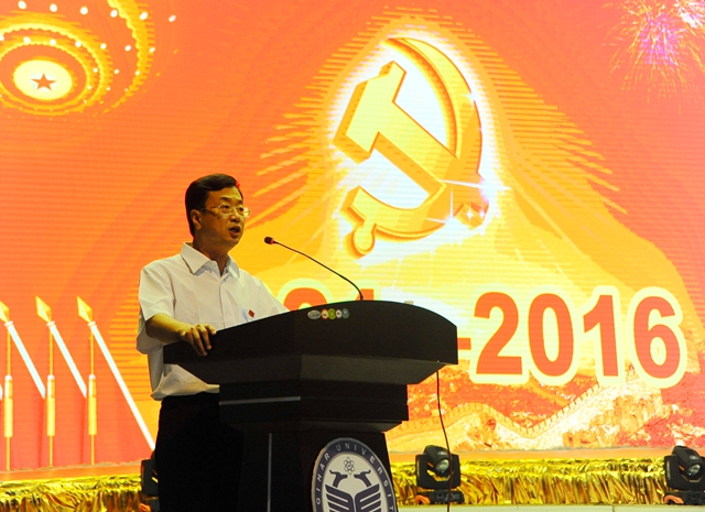 校党委副书记盖元臣代表学校党委讲话。他说,今天,我们隆重集会,热烈庆祝伟大的中国共产党成立95周年,就是要重温党的光辉历史,讴歌党的丰功伟绩,坚定永远跟党走的信念。通过表彰近年来涌现的先进基层党组织、优秀共产党员和优秀党务工作者,进一步激发我们争做“四讲四有”合格党员的热情,为推进学校高水平大学建设事业击鼓奋进、再创佳绩、再立新功!我谨代表学校党委向学校各基层党组织和勤奋工作在教学、科研、管理、服务等各条战线上的全体教职工党员,向曾经为学校建设和发展做出贡献的离退休老党员,向勤奋学习、健康成长的青年学生党员表示节日的祝贺和诚挚的问候!向受到表彰的先进党组织和优秀个人表示热烈的祝贺并致以崇高的敬意!