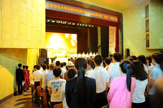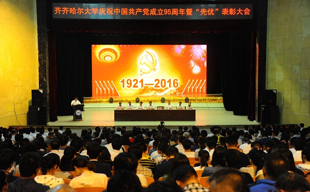 庆祝表彰大会在国歌声中隆重开幕。校党委常委、副校长邓启刚宣读了学校党委《关于命名表彰先进基层党组织、优秀共产党员和优秀党务工作者的决定》(齐大党字[2016]14号)和《关于对在全校庆祝中国共产党成立95周年暨党的知识竞赛中获奖的集体和个人进行表彰的决定》(齐大党组字[2016]7号)。