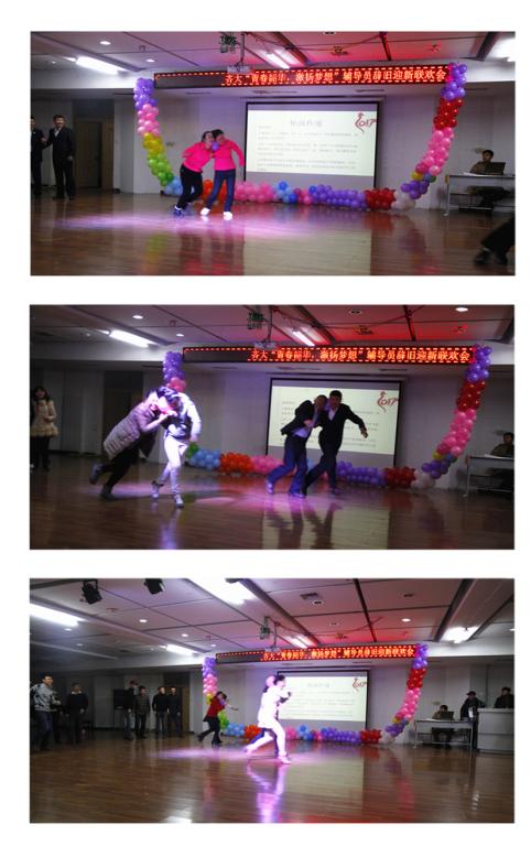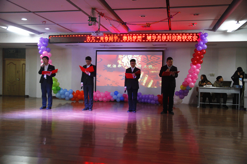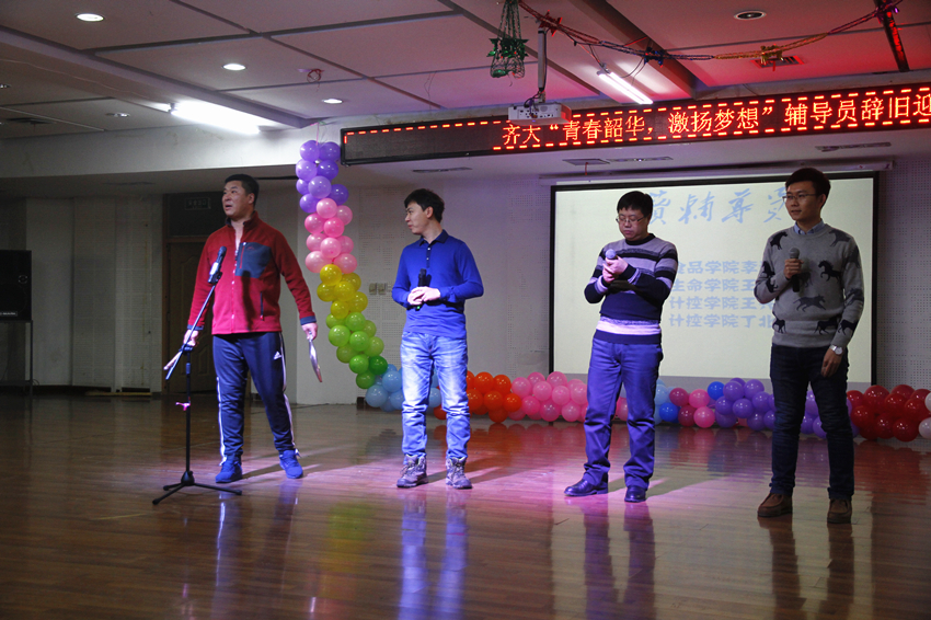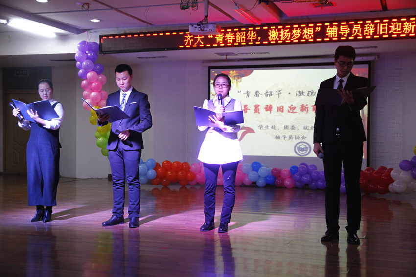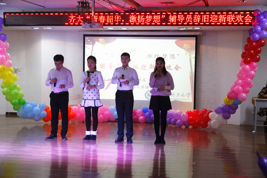 联欢晚会由通信与电子工程学院辅导员李兴涛、化学与化学工程学院辅导员路艺、外国语学院辅导员郭雪冬、机电工程学院辅导员庞晓远四人联袂主持。