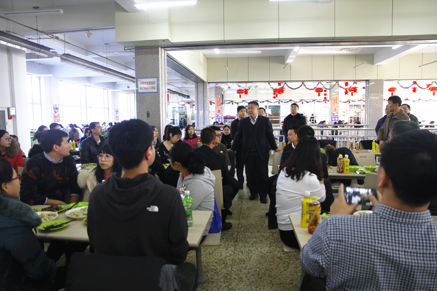 30日中午,校长马立群,校党委副书记盖元臣,校党委常委、常务副校长郑喜群在东区学生食堂看望了全体学工干部和辅导员,并亲切合影留念。