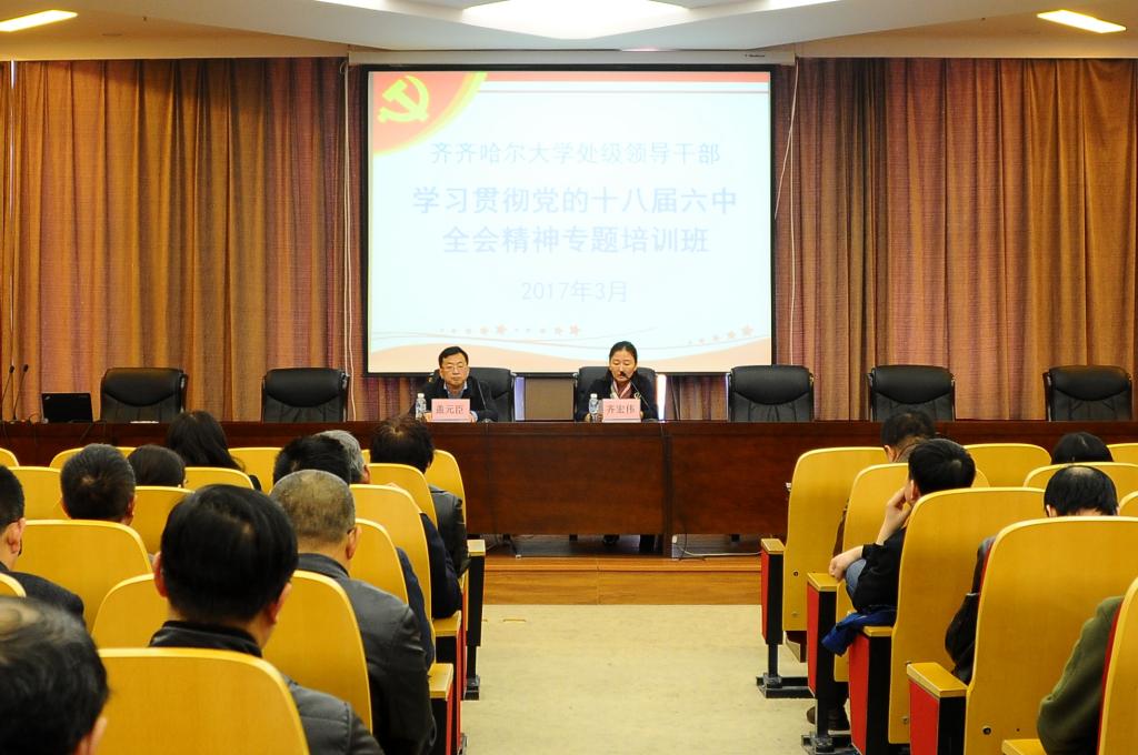 为深入学习贯彻习近平总书记在党的十八届六中全会和省部级主要干部专题研讨班上的重要讲话精神,以及省委书记王宪魁在全省高校思想政治工作会议上的讲话精神,贯彻落实《准则》《条例》,进一步落实党建主体责任,增强领导干部“四个意识”特别是政治意识和看齐意识,旗帜鲜明讲政治。3月31日上午,beats365在德润大厦四楼会议室举办全校处级领导干部学习贯彻党的十八届六中全会精神专题培训班。培训班由校党委副书记齐宏伟主持。