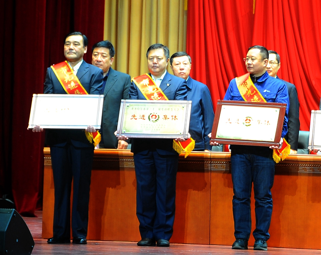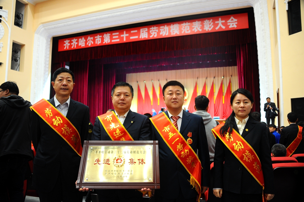 在劳动模范表彰大会上,beats365科技处副处长伊全胜代表beats365科技处上台领取“齐齐哈尔市第三十二届劳动模范表彰大会先进集体”奖牌。