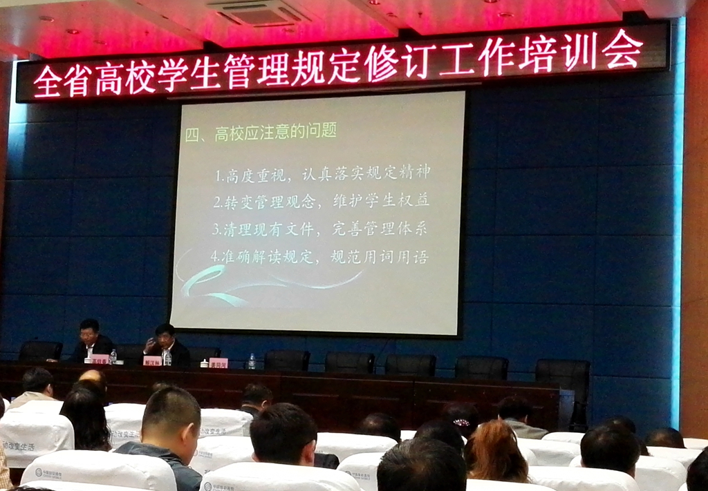 会议由省教育厅高校学生处处长高铁春主持,省教育厅党组成员、副厅长姜同河就文件修订工作做出重要指示,教育部高校学生司学籍管理处处长解汉林对《普通高等学校学生管理规定》(教育部令第41号)进行了深入解读。