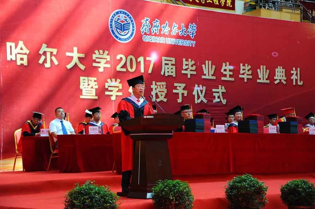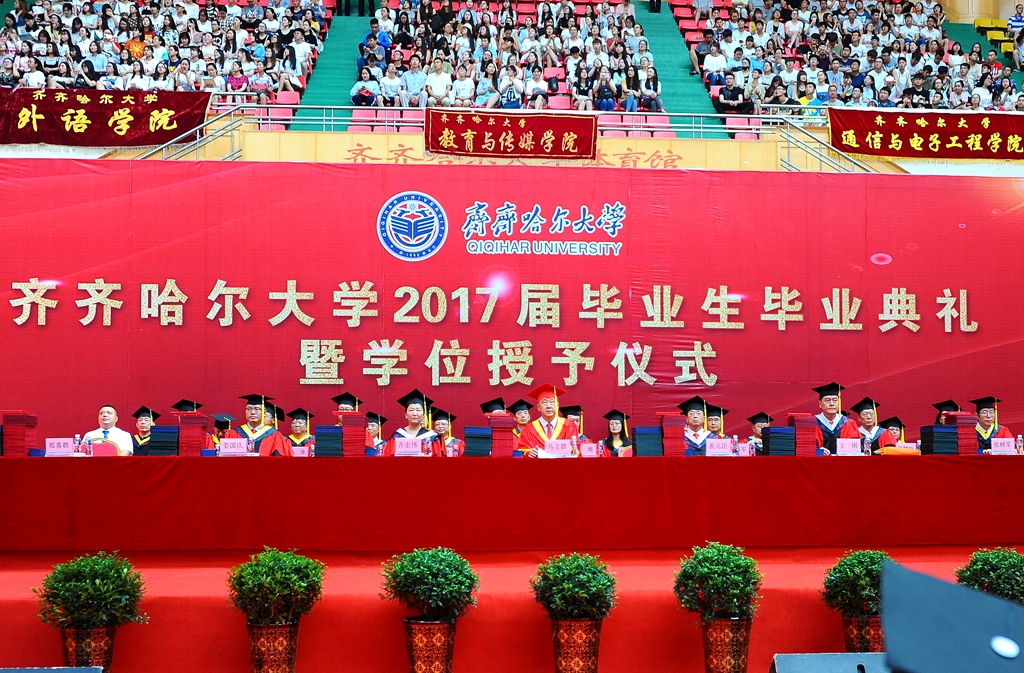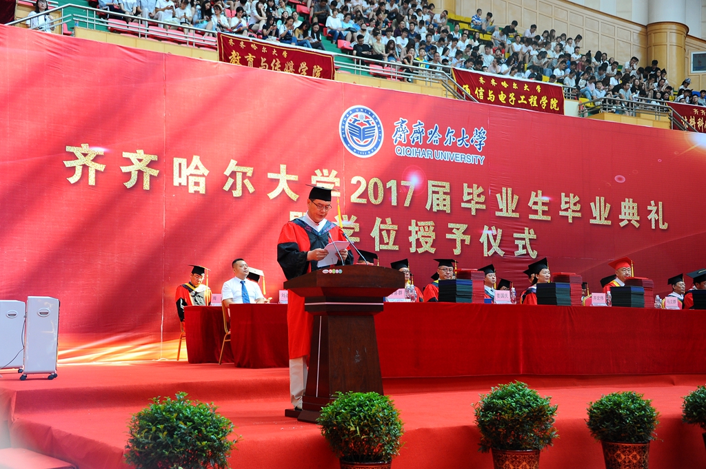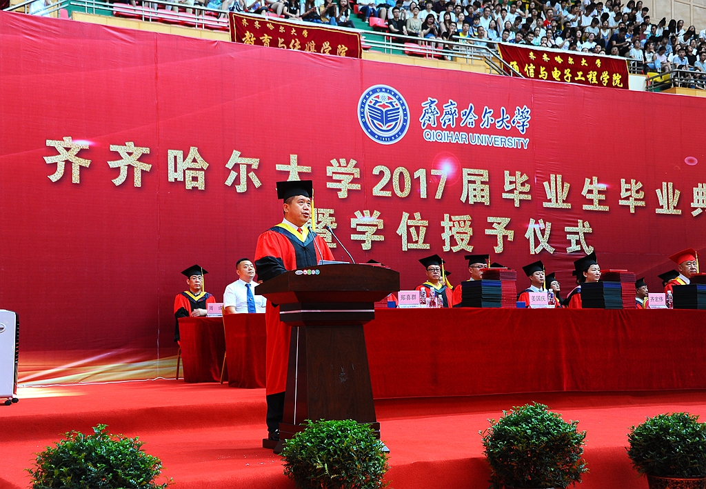 校长马立群、校党委副书记盖元臣、校党委副书记齐宏伟、常务副校长郑喜群、副校长王刚、纪委书记姜国庆、副校长张树军出席典礼。学校学位评定委员会成员及各学院院长,优秀校友代表、齐大广州校友会会长、元通高科信息化公司董事长刘德权等参加毕业典礼暨学位授予仪式并在主席台就座。即将奔赴祖国各地的3000余名毕业生代表参加了典礼,典礼由常务副校长郑喜群主持。