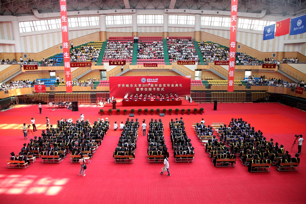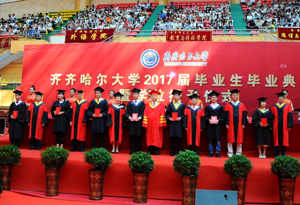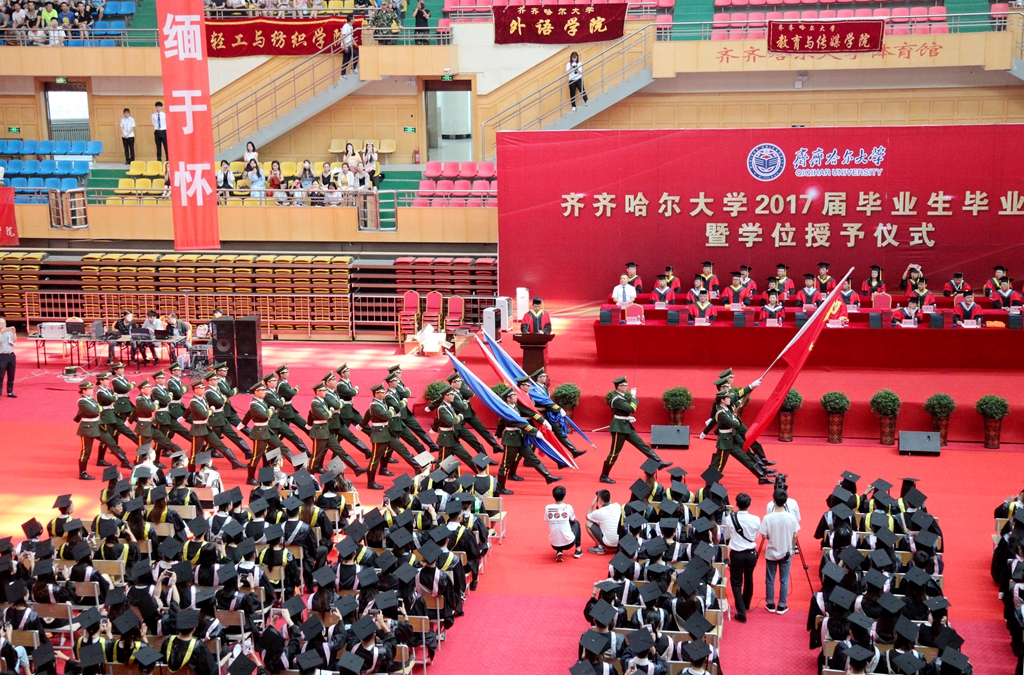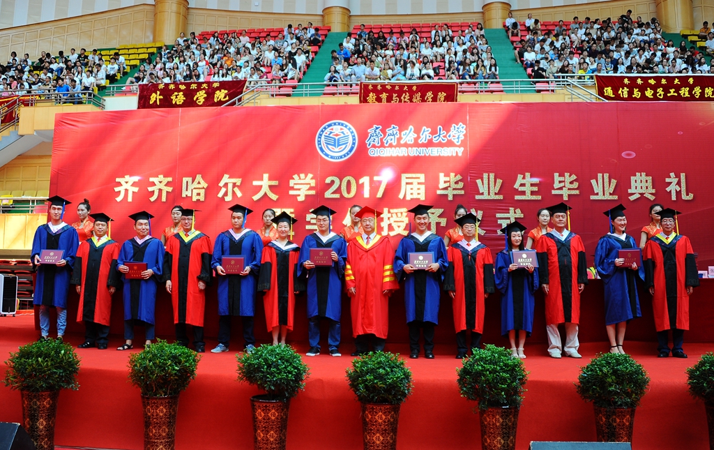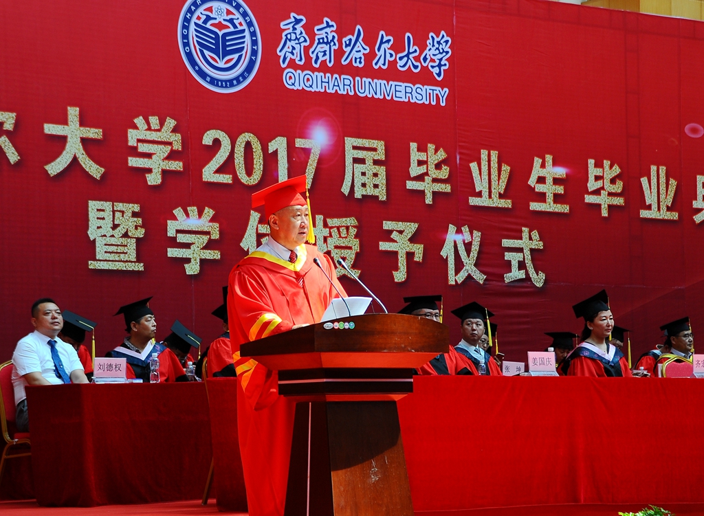 校长马立群、校党委副书记盖元臣、校党委副书记齐宏伟、常务副校长郑喜群、副校长王刚、纪委书记姜国庆、副校长张树军出席典礼。学校学位评定委员会成员及各学院院长,优秀校友代表、齐大广州校友会会长、元通高科信息化公司董事长刘德权等参加毕业典礼暨学位授予仪式并在主席台就座。即将奔赴祖国各地的3000余名毕业生代表参加了典礼,典礼由常务副校长郑喜群主持。